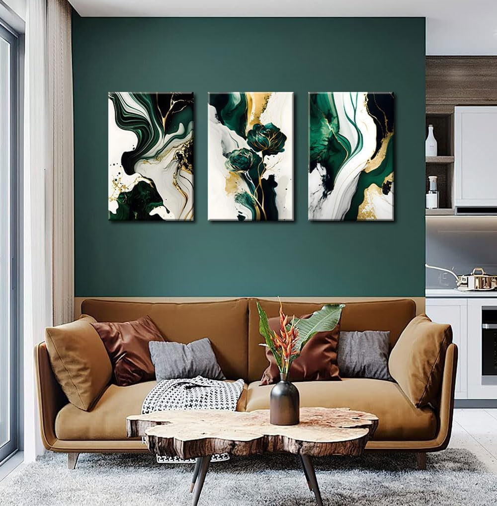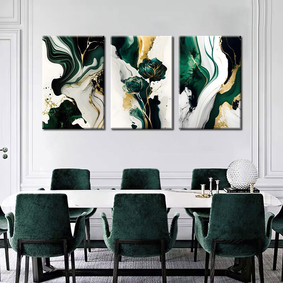 3 bức tranh tường màu xanh ngọc lục bảo đóng khung, tranh vải canvas đá cẩm thạch trừu tượng màu xanh lá cây và vàng hiện đại, tranh in, áp phích, tranh trang trí tường cho phòng khách, phòng ngủ, văn