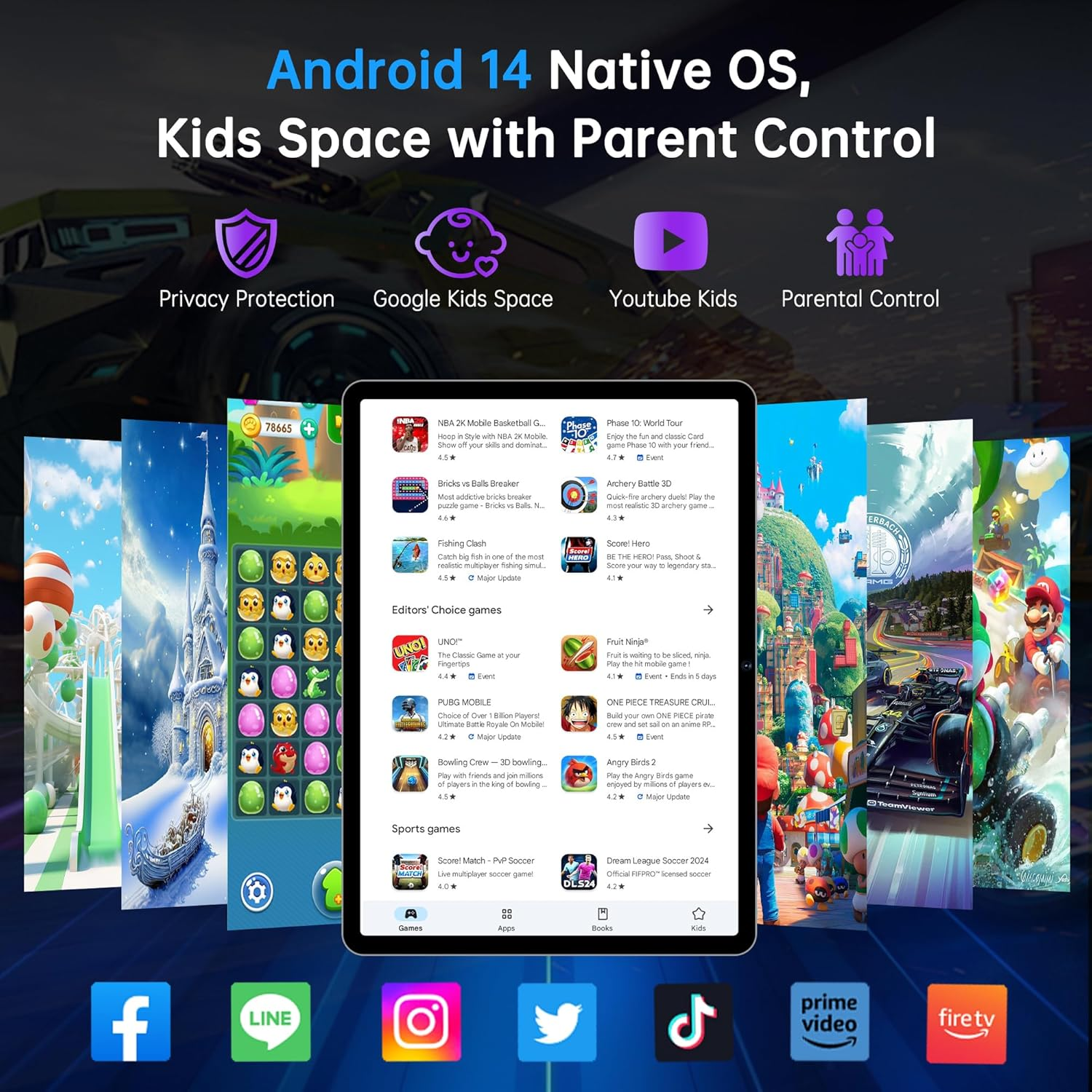 Smooth and Stable OS - 2025 the latest Android tablet runs the Android 14 OS, which features its enhanced privacy, parental control, easy split screen and screen projection. This 10 inches tablet is equipped with a 2.0GHz 64-bit CPU and 10GB RAM (3GB+7GB Expand), which ensures stable productivity and entertainment performance, providing a seamless, energy-efficient tablet experience suitable for work, light gaming, and HD video playback.