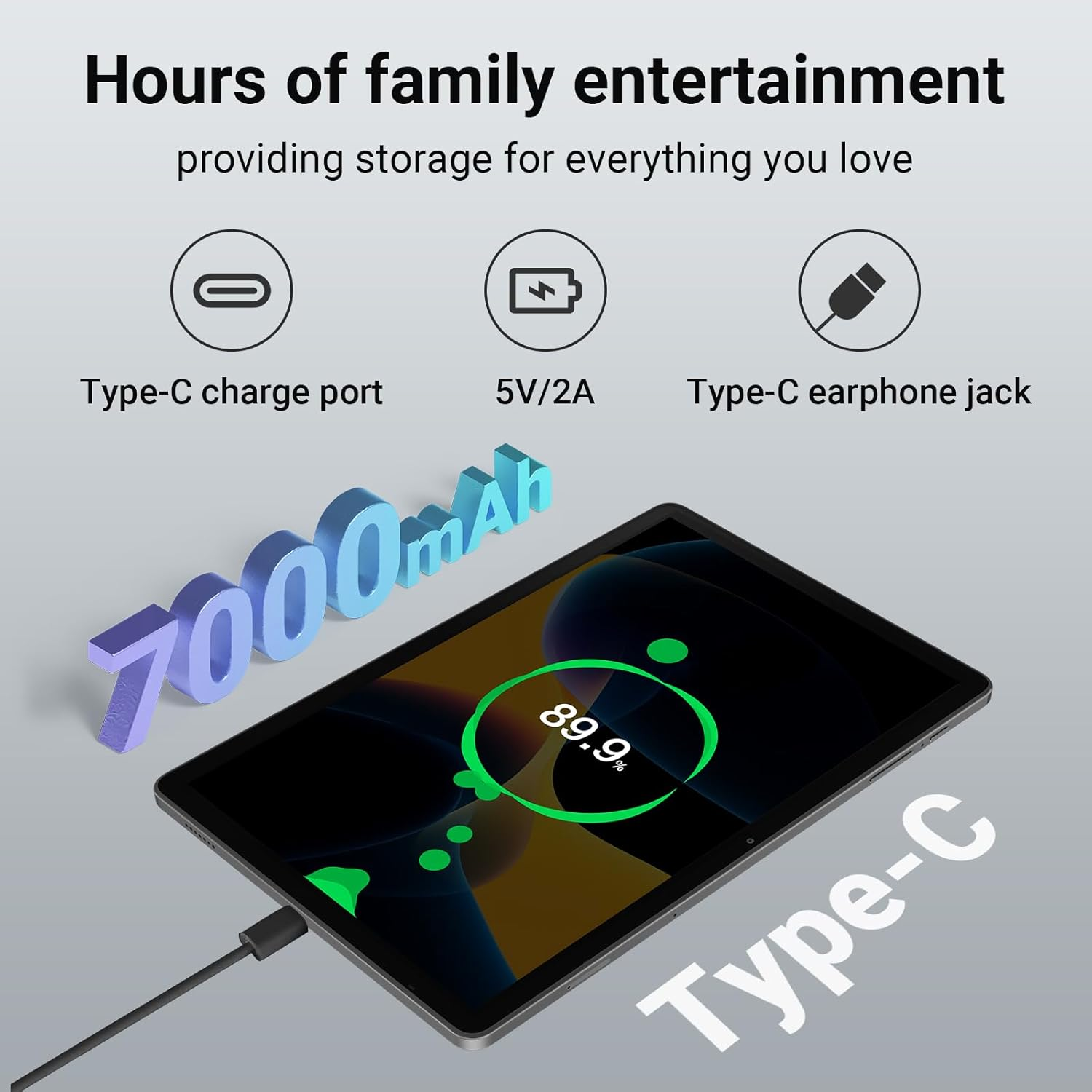 7000mAh Large Battery, Dual Stereo Speakers: The 11 inch tablet has a 7000mAh large-capacity battery. It can provide longer use time. The reversible Type-C charging port allows easy connection from either direction. It supports better power transfer, wider compatibility, and enhanced battery durability. Thanks to a separate Type-C headphone jack, you can charge or listen to music without interference. Dual stereo speakers provide rich stereo sound for an immersive audio experience