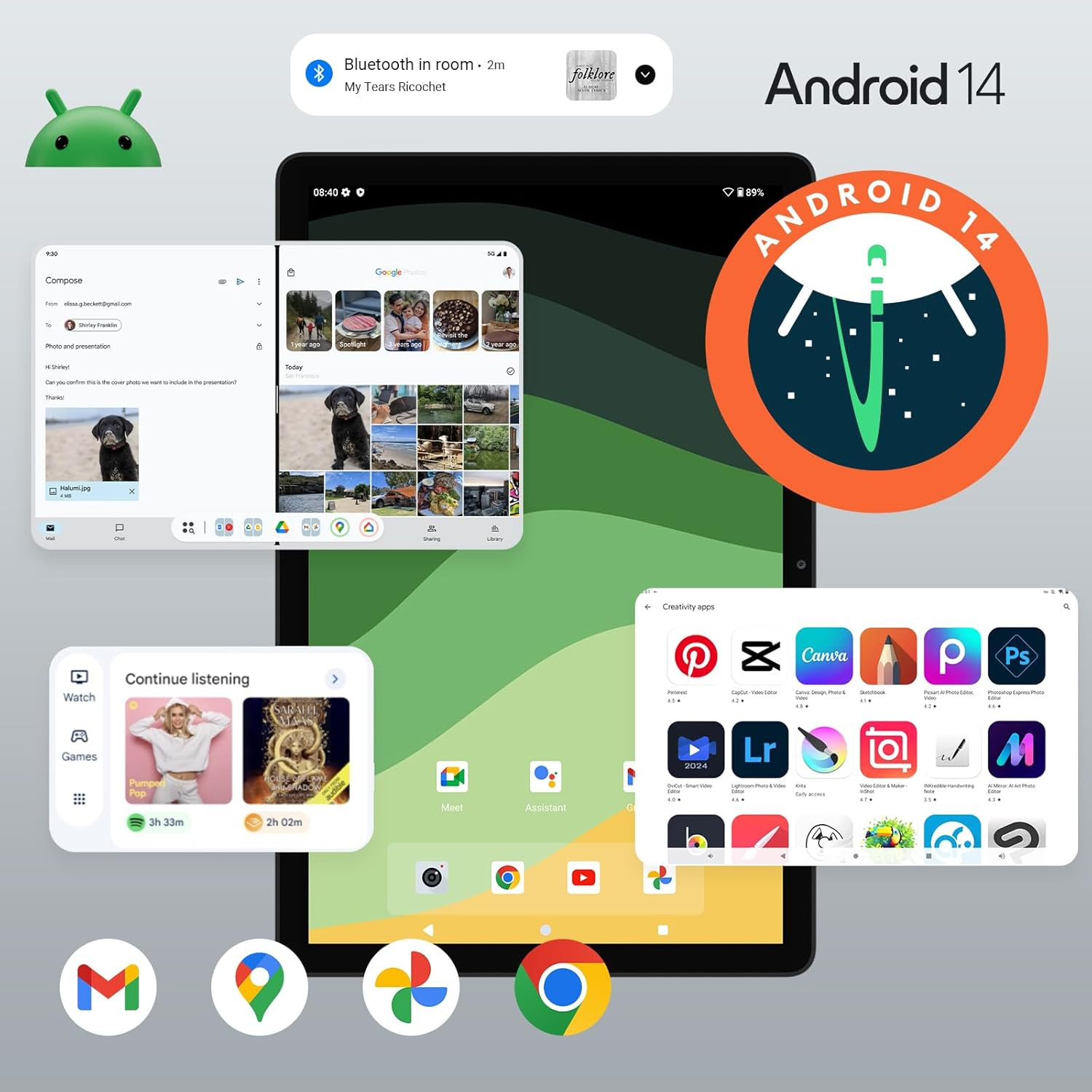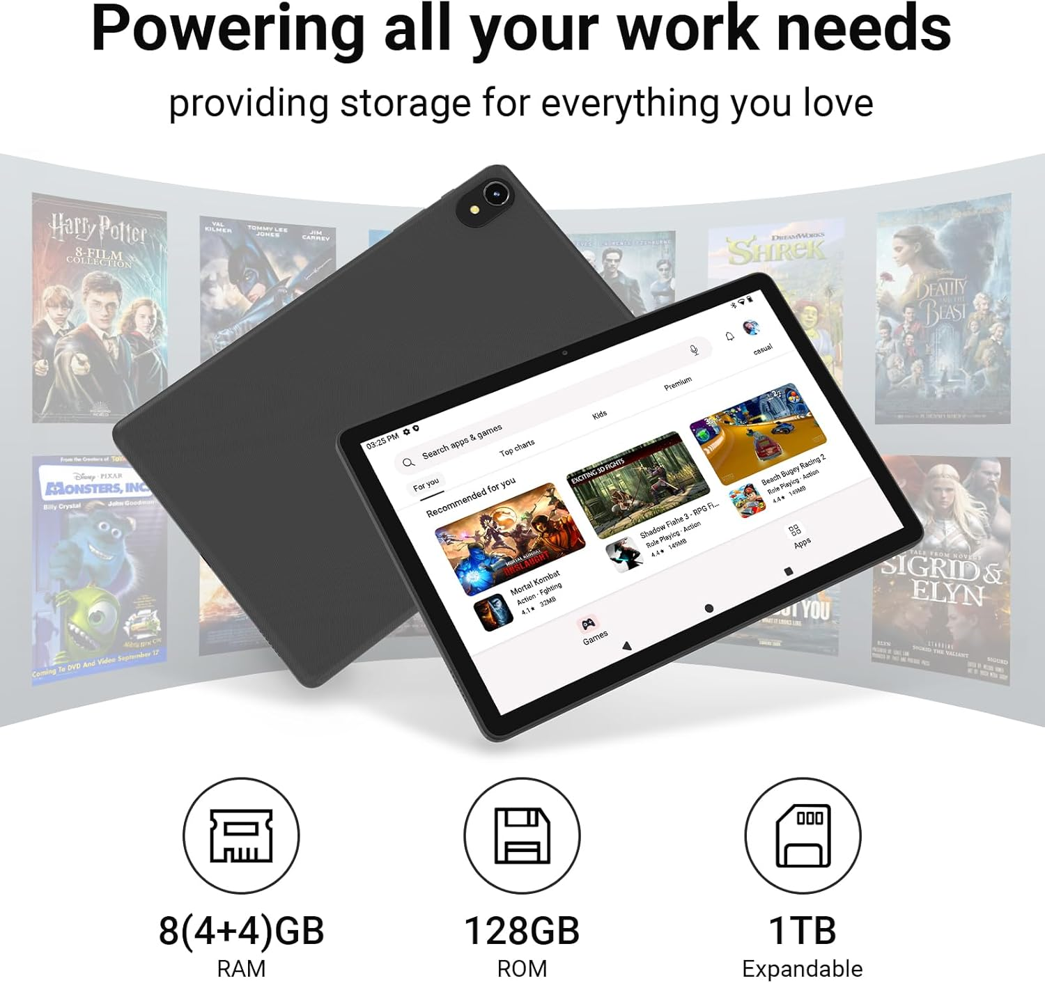 Widevine L1 Compatible 11-Inch HD IPS Incell Screen: The Android tablet has a 1280×800 HD IPS display, delivering clear and vivid visuals. Incell full-lamination technology enhances color brightness and makes images more realistic. It also supports Widevine L1 for watching videos on major streamers like Netflix, Amazon Prime Video, Disney+, Hulu, and YouTube. The Widevine L1 protection ensures content security and copyright protection, offering a high-quality entertainment experience