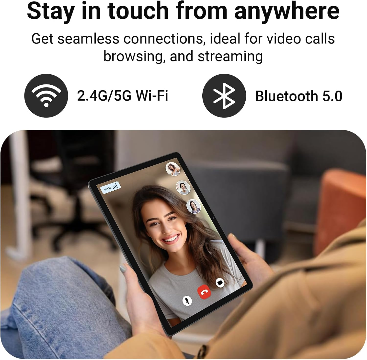 2.4G/5G Dual-Band WiFi, 5MP + 8MP Dual Cameras: The Android 14 tablet supports 2.4/5GHz dual-band WiFi for a more stable and faster network connection. The EP1095T Tab 11 tablet features Bluetooth 5.0, ensuring quicker and more stable wireless connections. Pair with Bluetooth headphones, speakers, and more for high-quality audio. It's equipped with a 5MP front camera and an 8MP rear camera, allowing you to capture clear photos and videos to document your wonderful moments