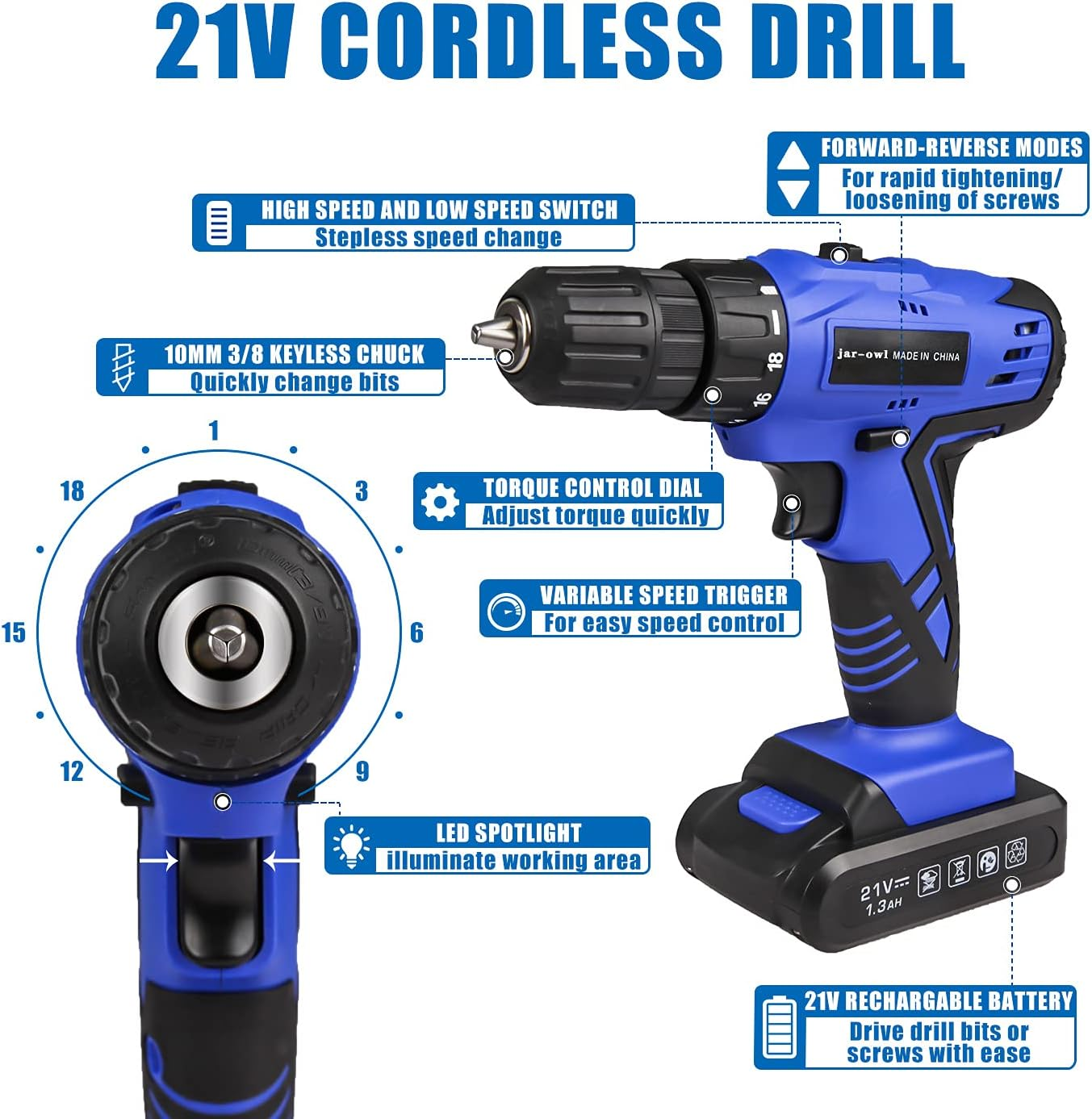 Động cơ toàn bộ bằng đồng, Máy khoan không dây công suất 21V có đèn LED】Máy khoan búa không dây 21V có thể điều chỉnh 18+1 tốc độ có thể khoan vào gỗ, kim loại, nhựa, v.v. Khả năng khoan tối đa là 22mm (7/8"") đối với gỗ, 10mm (3/8"") đối với thép. Tùy chọn 2 bánh răng với mô-men xoắn cực đại 247 in-lbs cho tốc độ khoan/lái cao (0-1350 vòng/phút) hoặc thấp (0-350 vòng/phút). Bộ kích hoạt tốc độ thay đổi tiến và lùi dễ dàng kiểm soát tốc độ khoan và đảo ngược mũi khoan