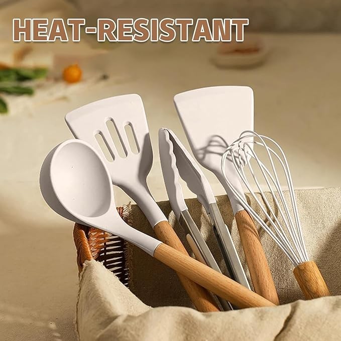 33 DURABLE WOODEN HANDEL KITCHEN UTENSILS SET: Anti scalding protect your hand from burning, 33 professional silicon Kitchen utensil set includeshe set includes flexible spatula, soup ladle,serving spoons pasta server, spatula turner , tongs, mesuring cup and spoons, 10 hooks, silicone mat and so on. Meet your all kinds of kitchen needs, Because of the wooden handle, We don't recommend soaking in water for a long time or dishwasher cleaning
