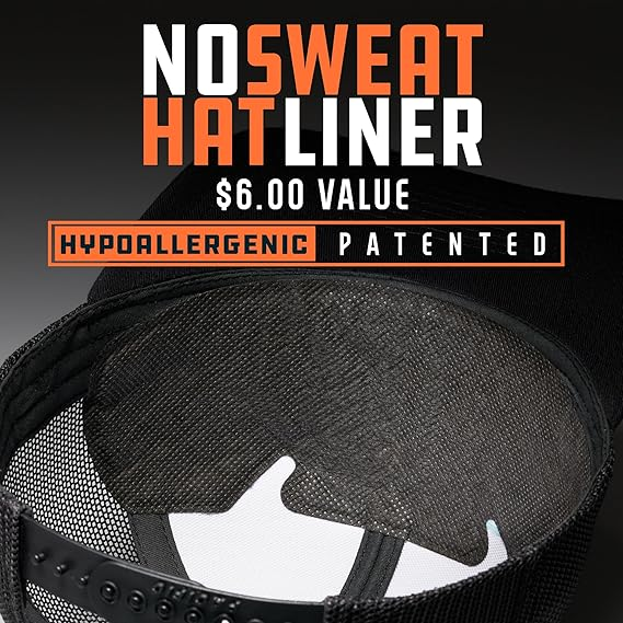 KHÔNG BAO GỒM LÓT MỒ HÔI: Có kèm theo lớp lót mũ chống dị ứng được cấp bằng sáng chế của No Sweat. Giá trị sáu đô la. Công nghệ Dri-LID được thiết kế để thấm mồ hôi ở trán. Mỏng, mềm và nhẹ. Công nghệ không mùi. Dính vào bên trong mặt trước trên đỉnh của dây đeo mồ hôi.