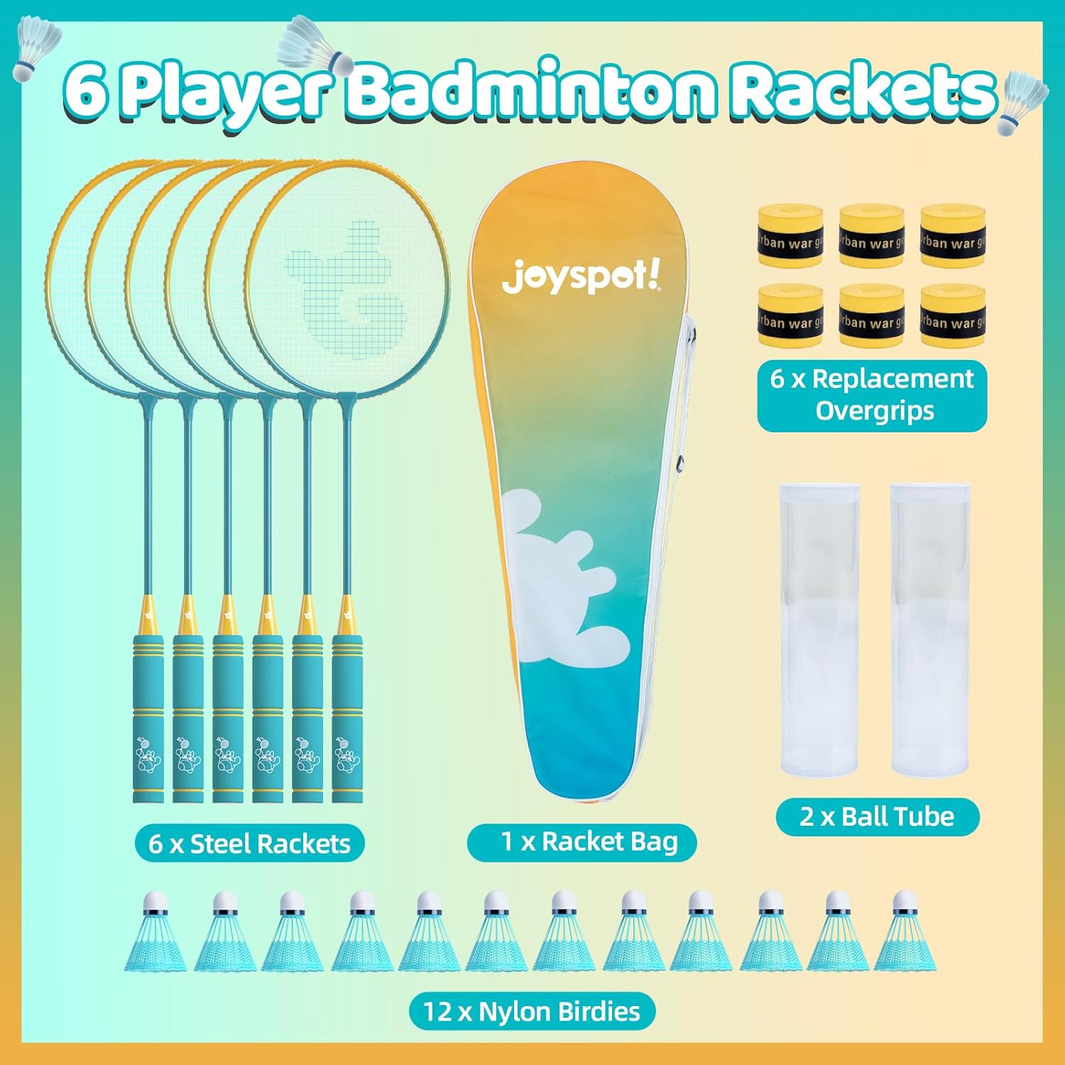 Badminton Racket Set with Carrying Bag: This set includes 6 steel badminton rackets, 12 nylon shuttlecocks, 6 grip tapes, and a large carrying bag. Each racket weighs 4.3 oz, promoting hand-eye coordination and a healthy lifestyle