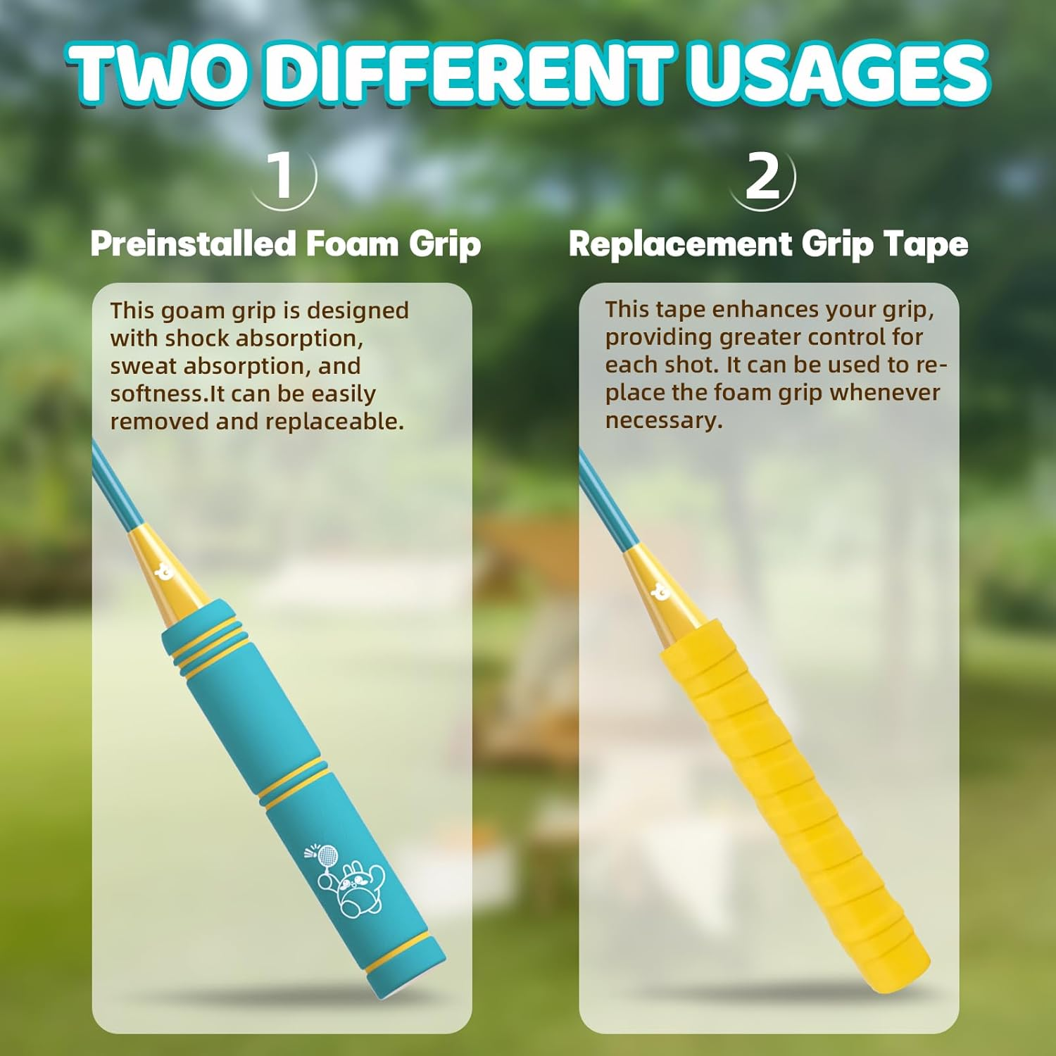 High-Quality Shuttlecocks and Grip Tapes: The set features 12 durable shuttlecocks with cork heads and nylon feathers for stability. Plus, 4 PU grip tapes provide excellent cushioning and sweat absorption for a better grip