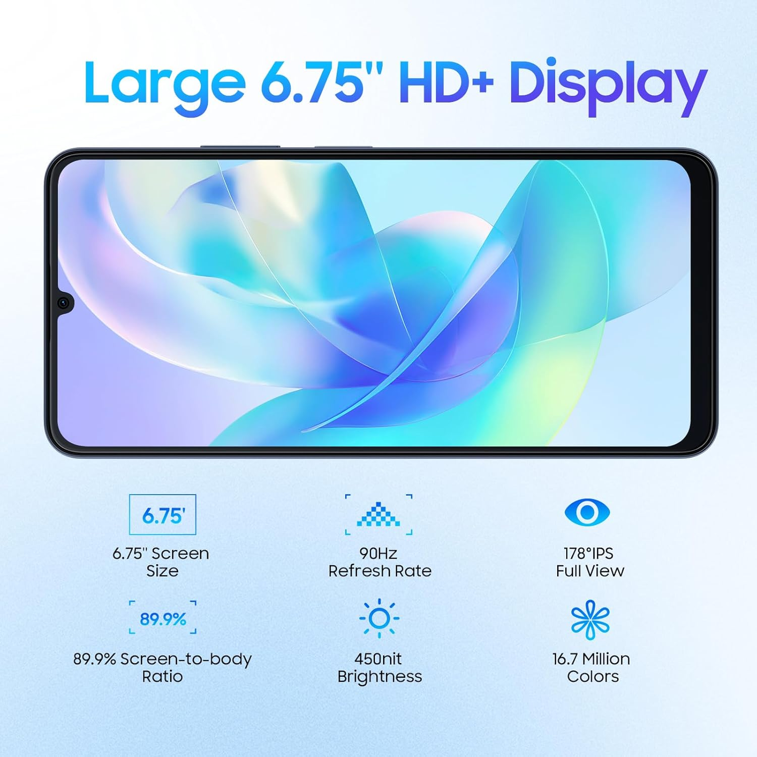 【6.75-inch Large Screen & Smart-K Box Speaker】Blackview COLOR 8 unlocked cell phone features a 6.75-inch display, offering over 90% screen usage and a smooth 90Hz refresh rate, providing a more comfortable viewing experience. High-fidelity colors, clear images, and Smart-K box speaker technology make movies and games more exciting. Enjoy full viewing angles, 10-point touch technology, and a bright display of up to 450 nits for happy moments anytime.