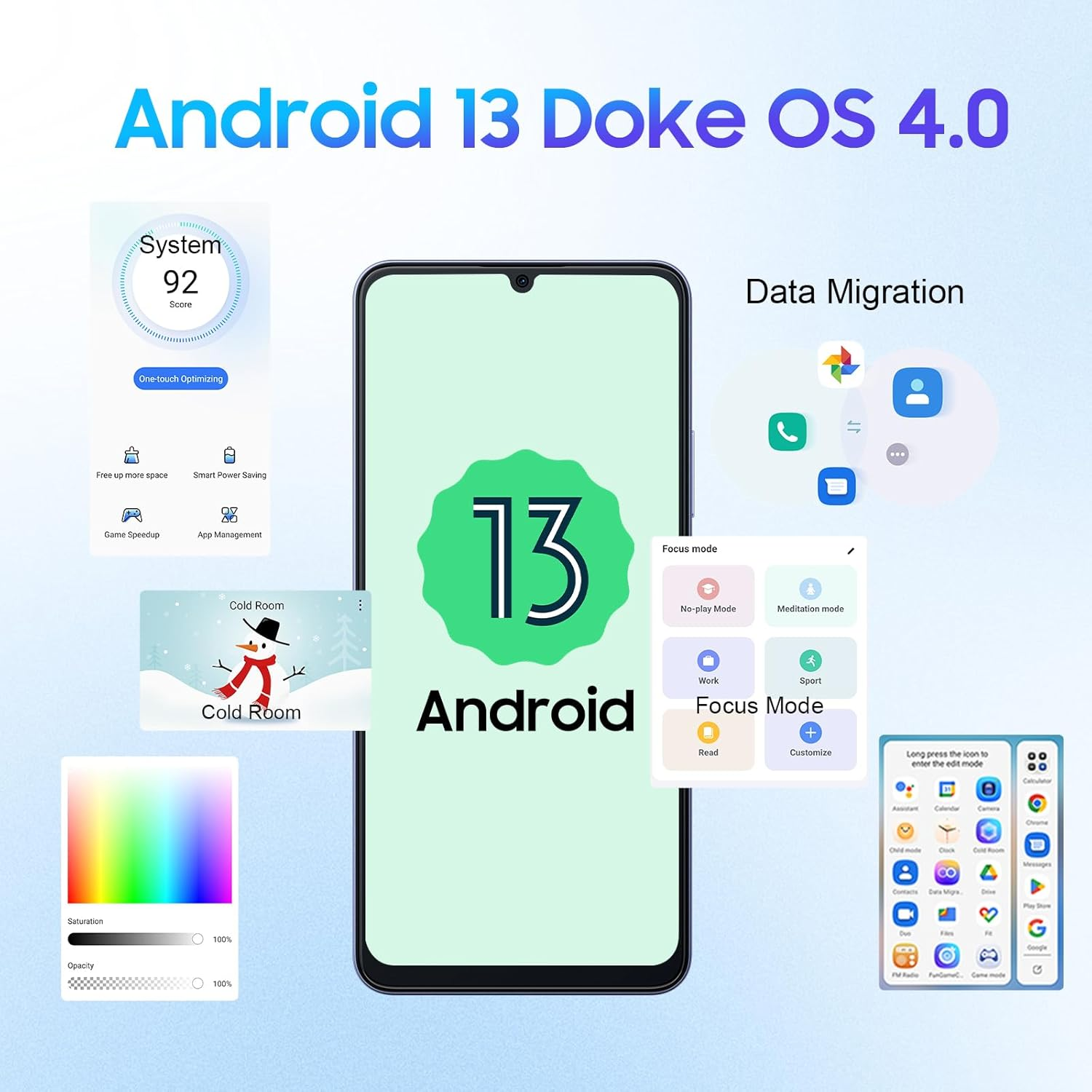 【Android 13 & Doke OS 4.0 System】This COLOR 8 unlocked android phones equipped with the latest Android 13 operating system, enhancing privacy protection and prevented privacy leakage from the root cause. This Android 13 smartphone offers per-app language preferences, improved UI experience, outdoor tools. Add EasyShare APP, faster than wireless BT, to achieve fast data transfer. But that's not all! With the integration of Doke OS 4.0, enjoy additional functionalities like call recording and exercise index tracking. Additionally, Provide real-time subtitles while watching videos, and many more exciting features and optimizations!