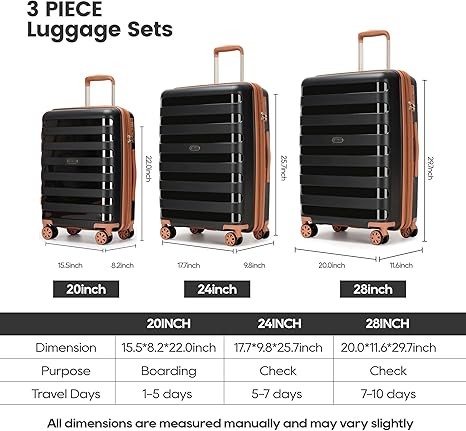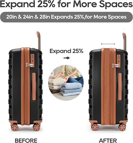 【3 Pcs Luggage Expandable double seal luggage】3 Pcs Luggage Expandable(All 20in, 24in and 28in are Expandable, adding 25%to the scalable space.) set to accommodate all your traveling needs ; Following sizes of suitcase are included: 20 inches(weight :7.3 lb), 24 inches(weight :9.3 lb) and 28 inches(weight :11.2 lb).Weight Capacity: 20inch: 33 lbs 24inch: 44 lbs 28inch: 55 lbs;