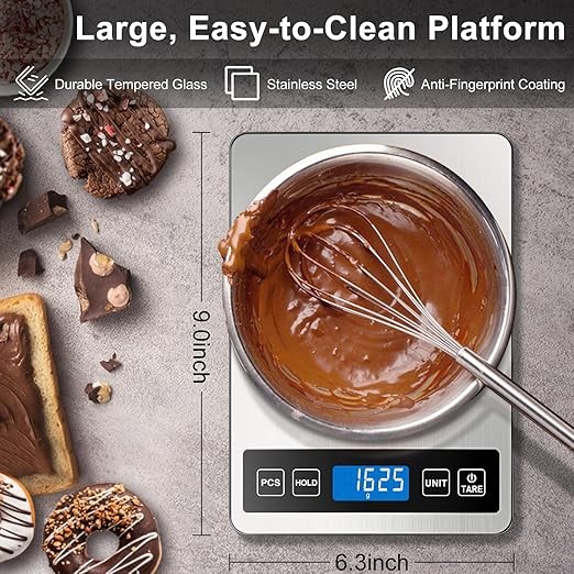 Large, Easy-to-Clean Platform: The 9"x6.3" weighing surface provides ample room for larger bowls and multiple ingredients. The top surface is made of durable tempered glass combined with stainless steel, which resists fingerprints and smudges, making it easy to wipe clean after use.