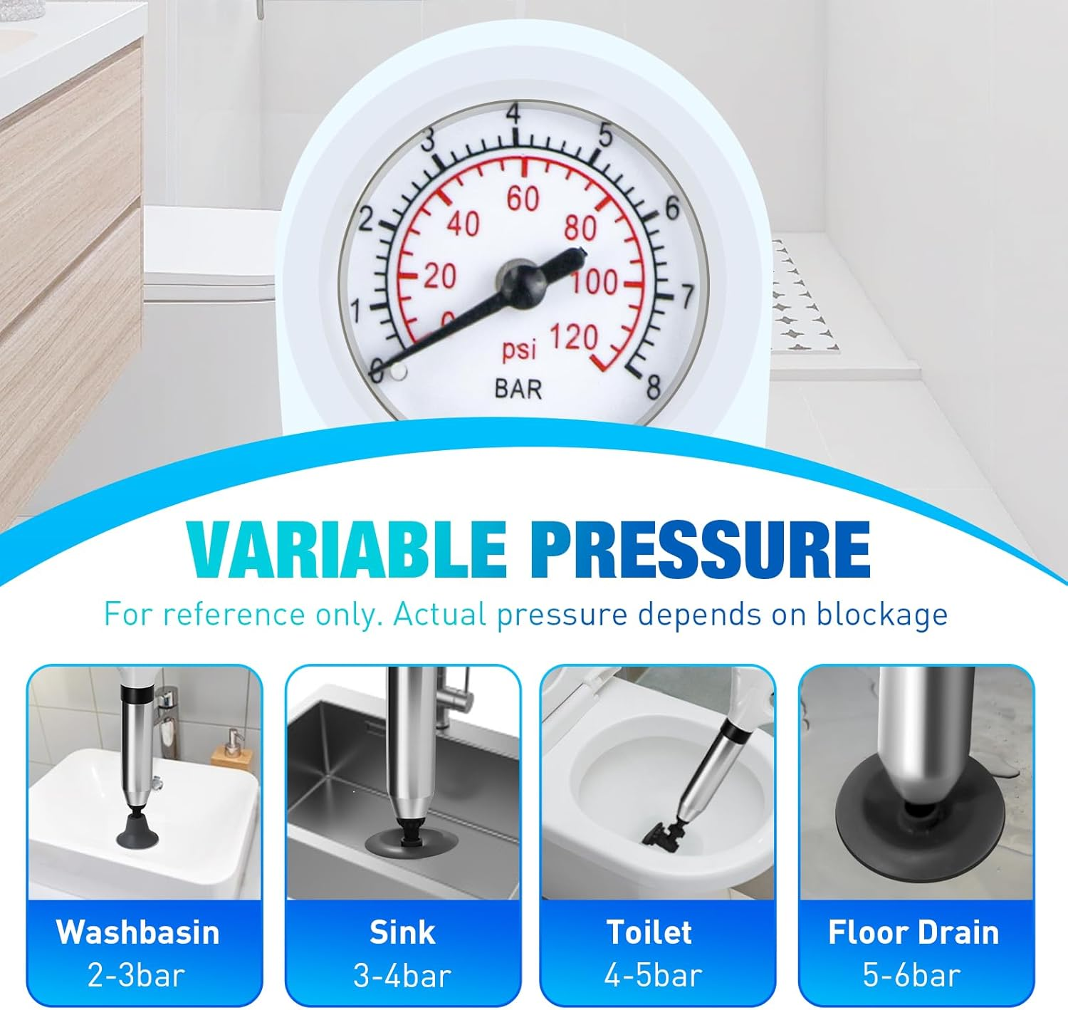 【Đồng hồ đo áp suất trực quan】Máy thông tắc bồn cầu có màn hình hiển thị áp suất theo thời gian thực giúp người dùng theo dõi và điều chỉnh áp suất không khí chính xác, ngăn ngừa bắn tung tóe và hư hỏng. Giá trị áp suất khuyến nghị: 2-3 Bar cho chậu rửa, 3-4 Bar cho bồn rửa nhà bếp, 4-5 Bar cho bồn cầu và 5-6 Bar cho cống thoát sàn. Chỉ để tham khảo. Áp suất thực tế phụ thuộc vào tình trạng tắc nghẽn