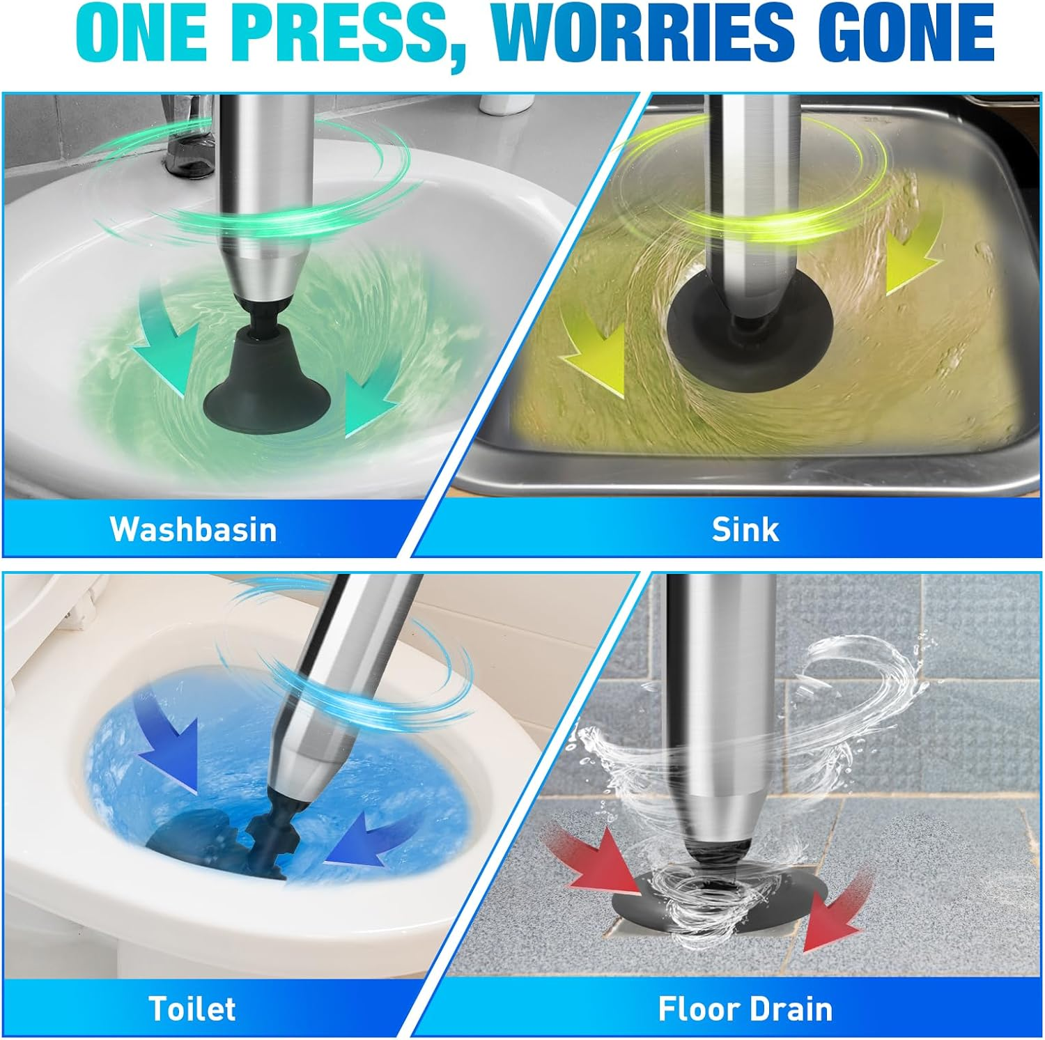 【Ứng dụng rộng rãi】Plunger bồn cầu đi kèm nhiều đầu có thể thay thế, giúp thông tắc bồn cầu, phòng tắm, bồn rửa nhà bếp và cống thoát sàn một cách linh hoạt. Plunger bồn cầu chịu lực cao loại bỏ hiệu quả tình trạng tắc nghẽn do tóc, dầu mỡ và các mảnh vụn khác gây ra, đảm bảo thoát nước dễ dàng khắp nhà bạn.