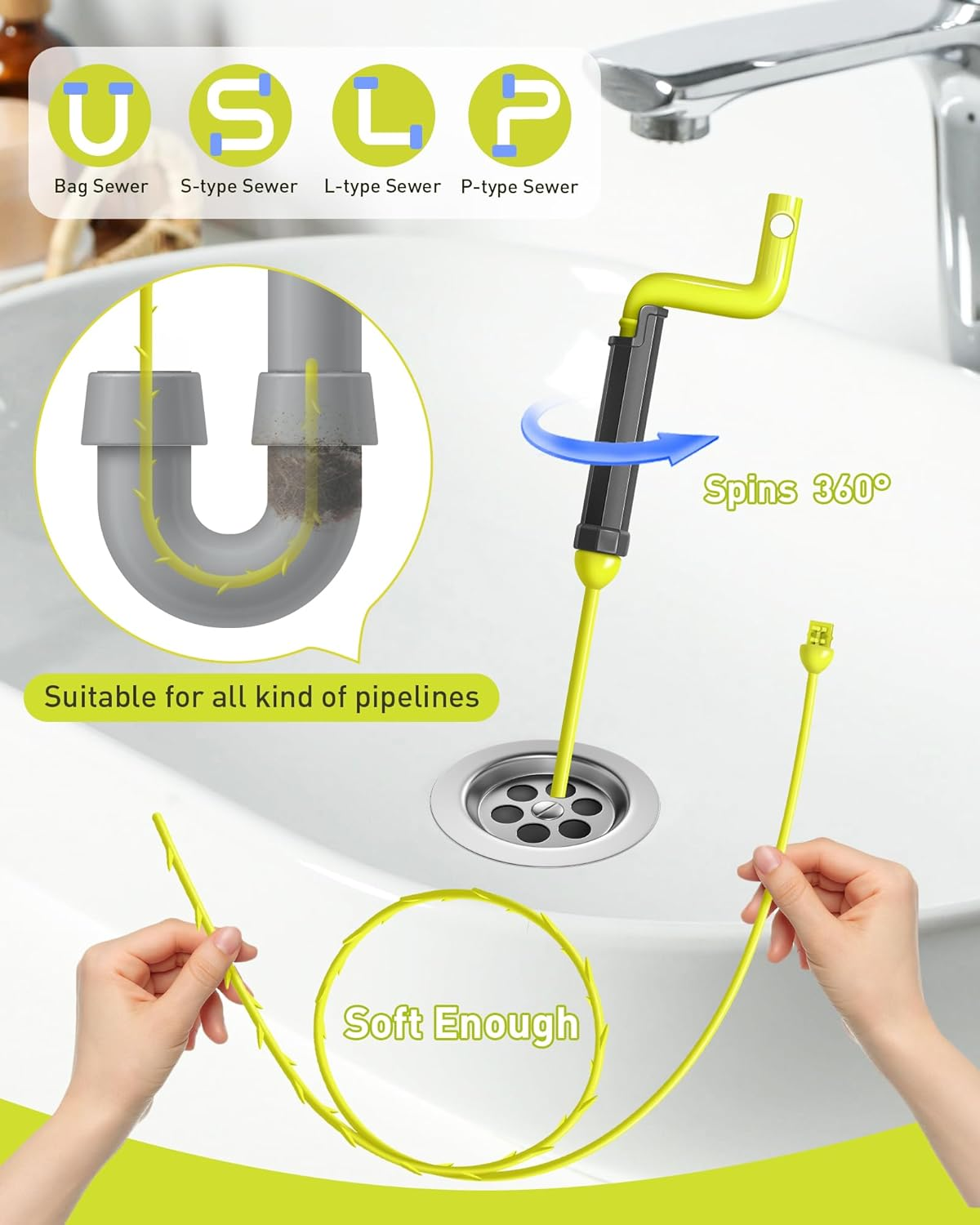 「Tay cầm xoay để tháo dễ dàng」: Được trang bị tay cầm xoay có thể tái sử dụng, dụng cụ này đảm bảo hoạt động không gặp rắc rối. Nếu rắn bị kẹt, chỉ cần xoay tay cầm để tháo ra an toàn mà không làm hỏng đường ống, không giống như các dụng cụ thông thường có thể bị kẹt vào các chỗ tắc nghẽn cứng.