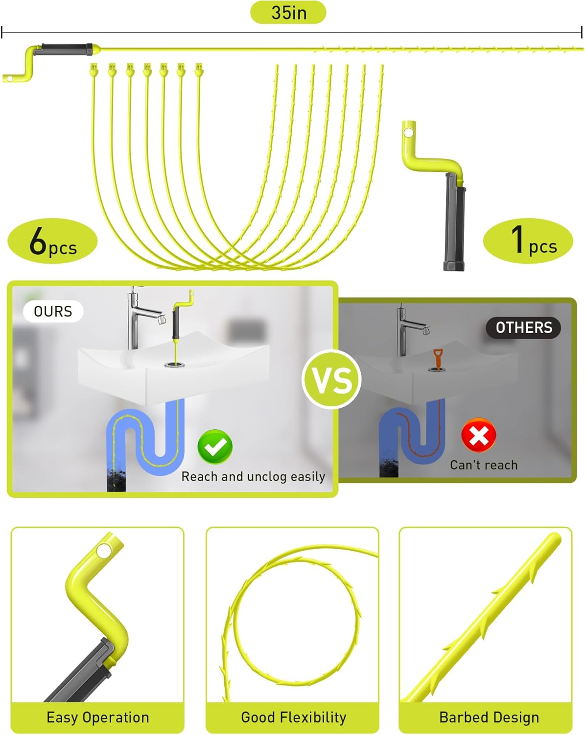Dụng cụ thông tắc cống xoay 35 inch, dụng cụ thông cống bắt tóc cho vòi hoa sen, nhà bếp, bồn rửa và bồn tắm, thiết kế nâng cấp để đi qua các lỗ thoát nước nhỏ, gói 6
