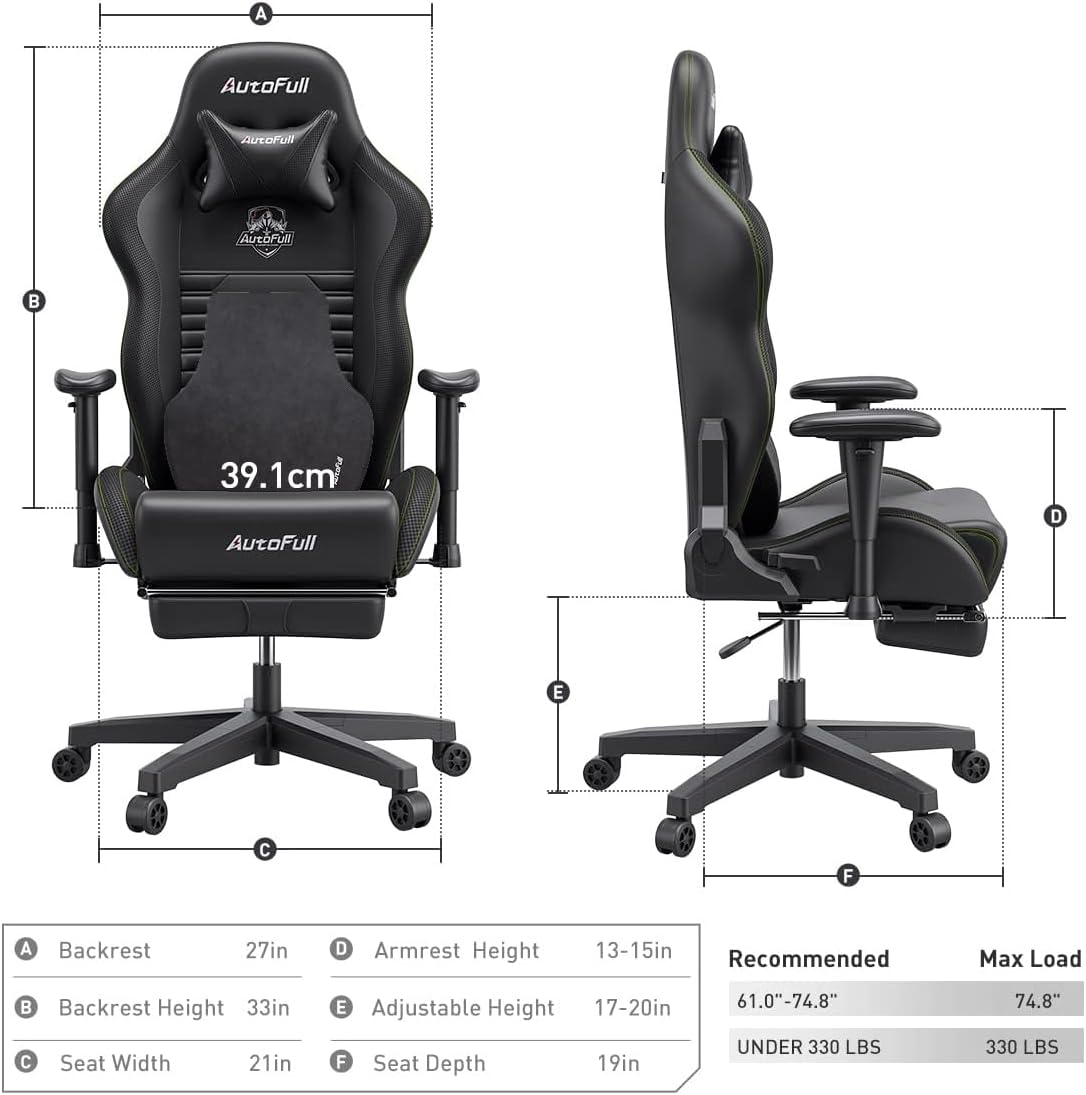 Ghế chơi game AutoFull C3, Ghế chơi game phong cách đua xe có hỗ trợ thắt lưng công thái học, Ghế PC da PU lưng cao có thể điều chỉnh có chỗ để chân, Màu đen