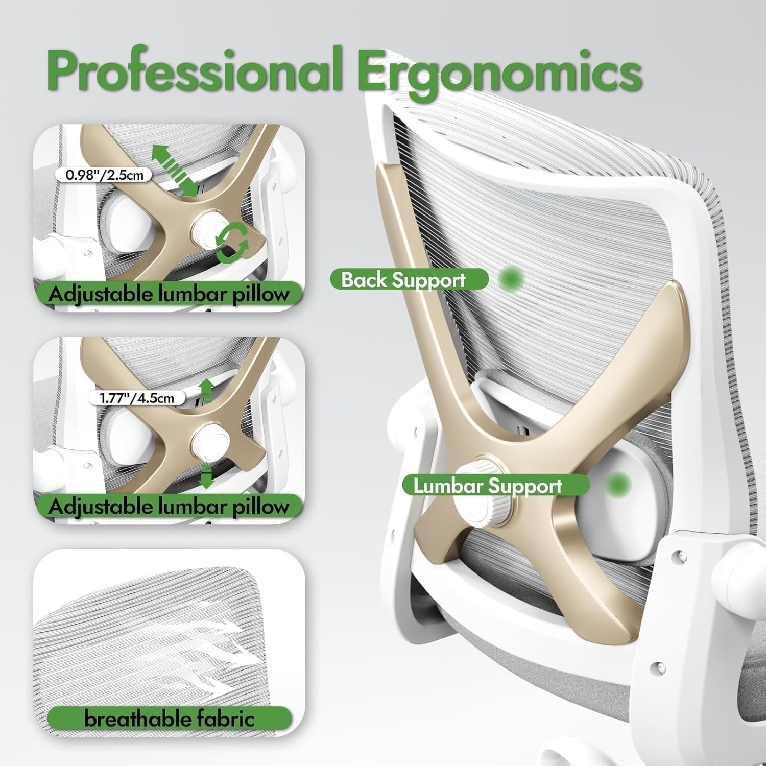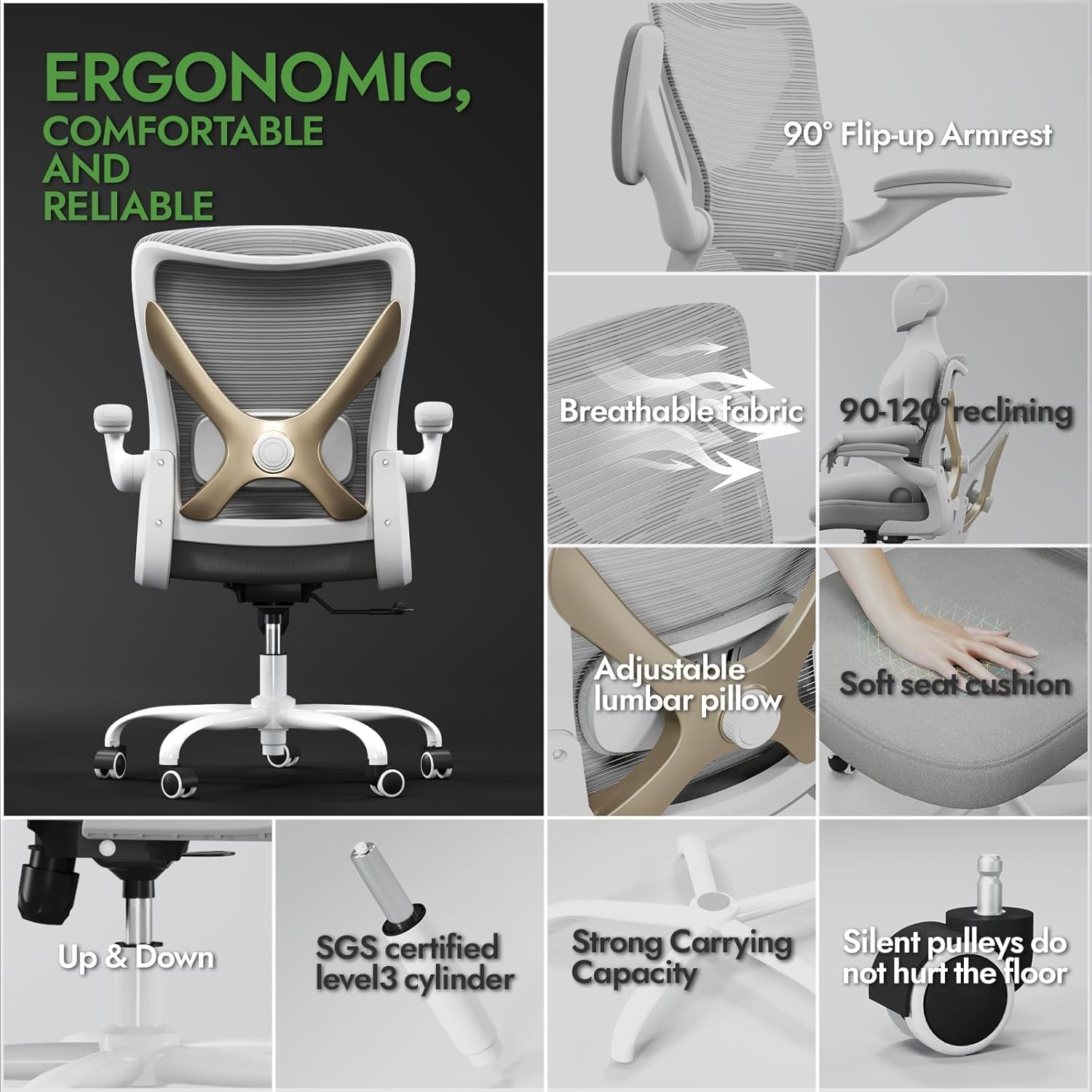 Ghế văn phòng công thái học có hỗ trợ thắt lưng - Ghế bàn máy tính có thể điều chỉnh cho văn phòng tại nhà, chơi game và làm việc - Ghế bàn thoải mái và hỗ trợ cho người lớn (Xám vàng)
