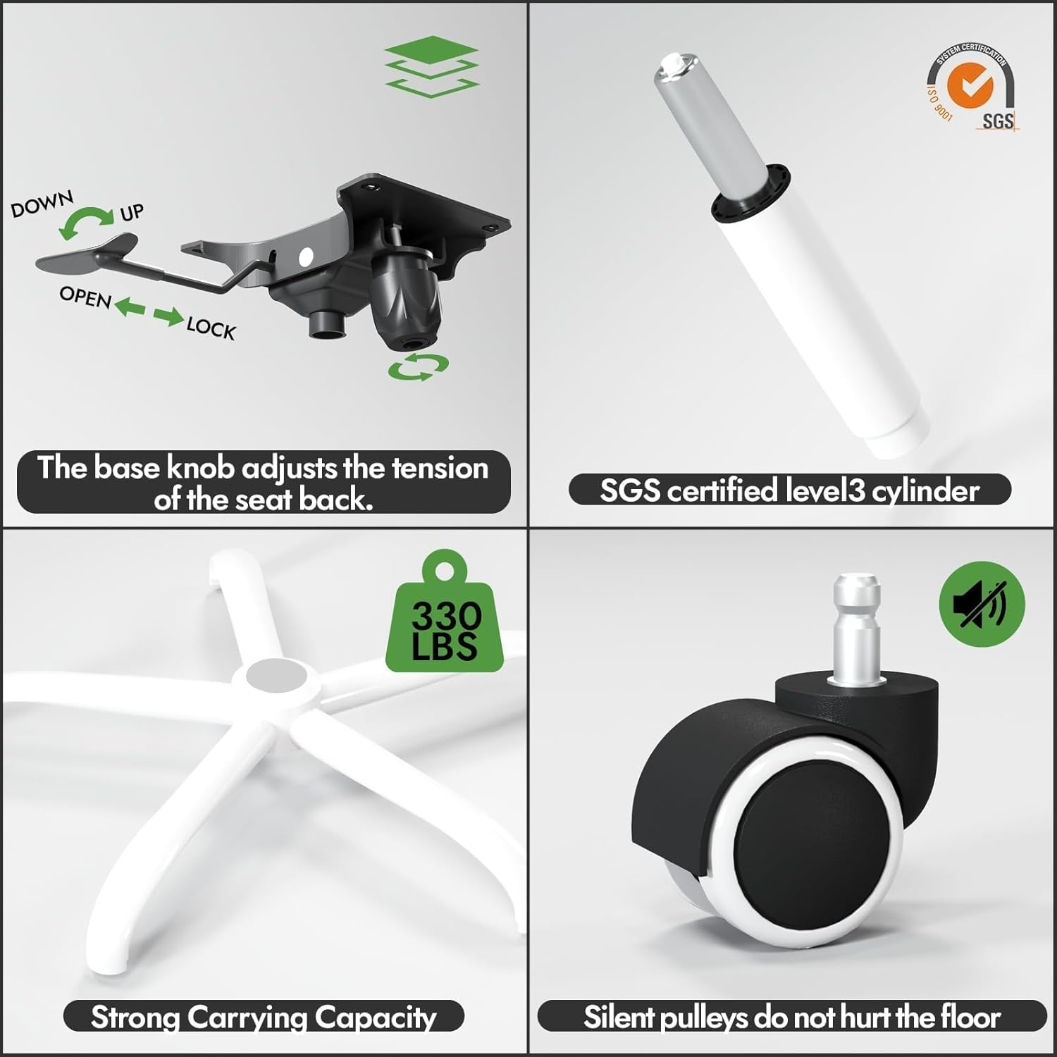 Tải trọng 330 lbs và kết cấu bền bỉ: Chiếc ghế này được làm bằng vật liệu chất lượng cao và có đế kim loại 5 điểm chắc chắn để đảm bảo độ bền và ổn định. Cho dù bạn đang làm việc hay chơi, hãy tận hưởng chiếc ghế được thiết kế để đáp ứng nhu cầu của bạn