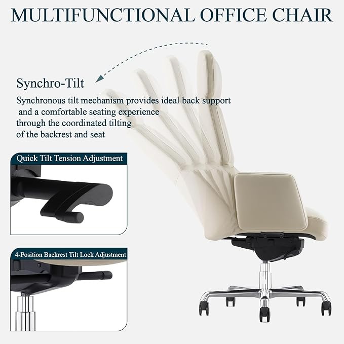 ERGONOMICALLY DESIGNED EXECUTIVE OFFICE CHAIR: This office chair features an integrated headrest and curved backrest, providing zoned support for your neck and lumbar spine. The quick-adjust backrest tension control and four-position tilt and lock functions offer optimal comfort and support.