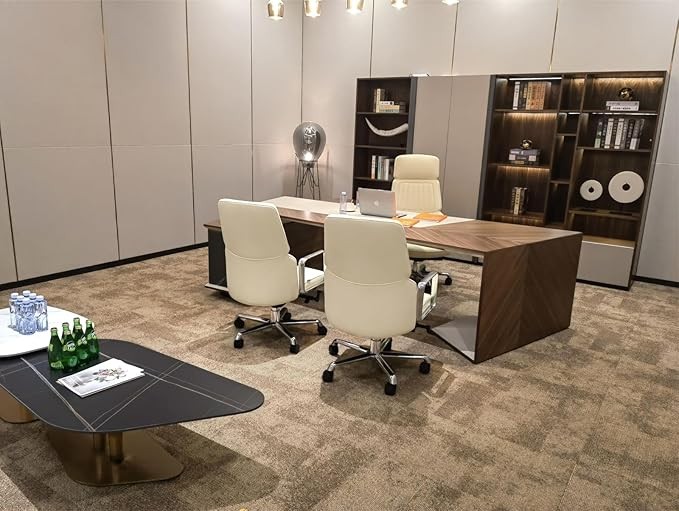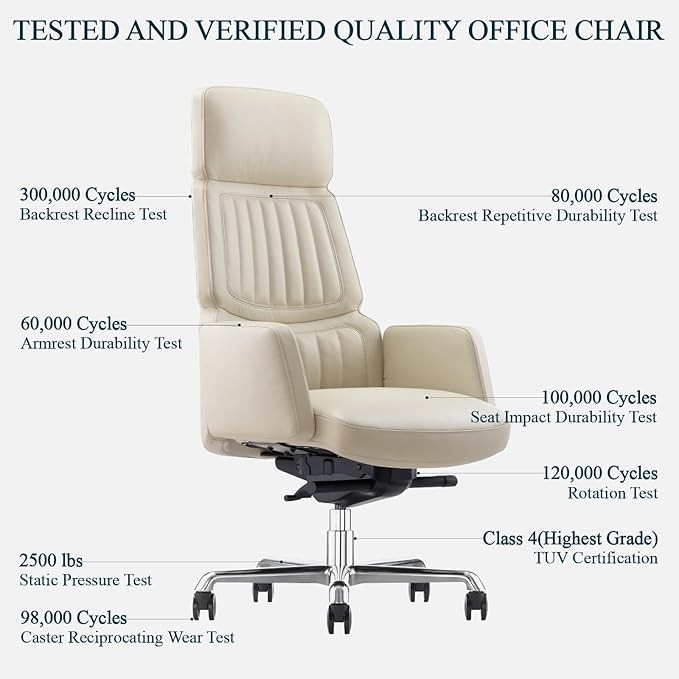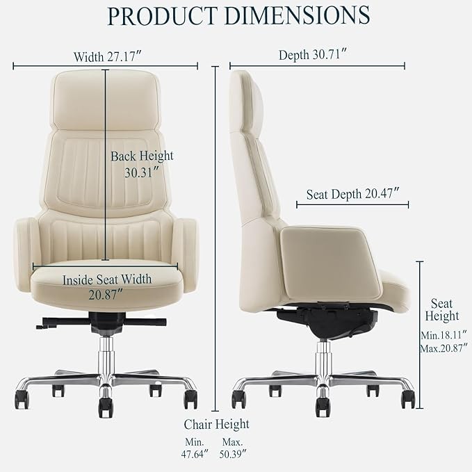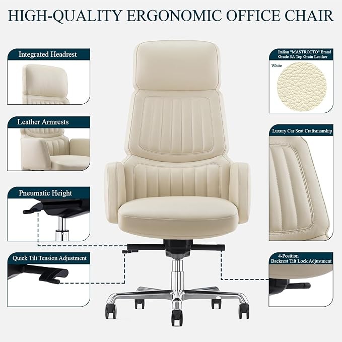 LUXURY TOP-GRAIN LEATHER OFFICE CHAIR: The contact surfaces are made of Italy's "MASTROTTO" brand top-grain leather, featuring natural leather texture, breathability, and comfort, with a leather thickness of 3-5 ounces. The non-contact surfaces are made of high-quality PU leather to provide durability and a cohesive look.