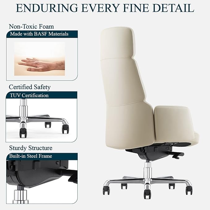 OUTSTANDING SEATING EXPERIENCE: The split seat and backrest design, curved back support, high-density molded foam cushion, and genuine leather armrests provide all-day support, ensuring comfort for long hours of work and study.