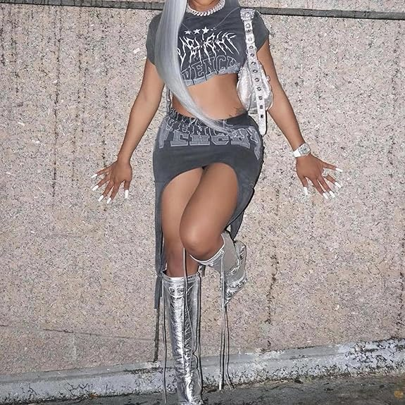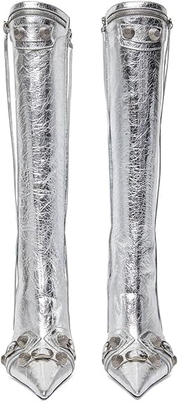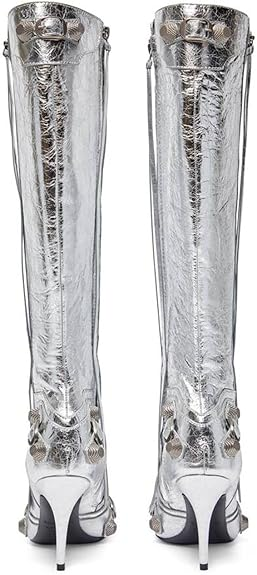 Giày bốt cao đến đầu gối có khóa, đinh tán màu bạc và khóa kéo trang trí, tạo điểm nhấn phong cách punk cho toàn bộ thiết kế.