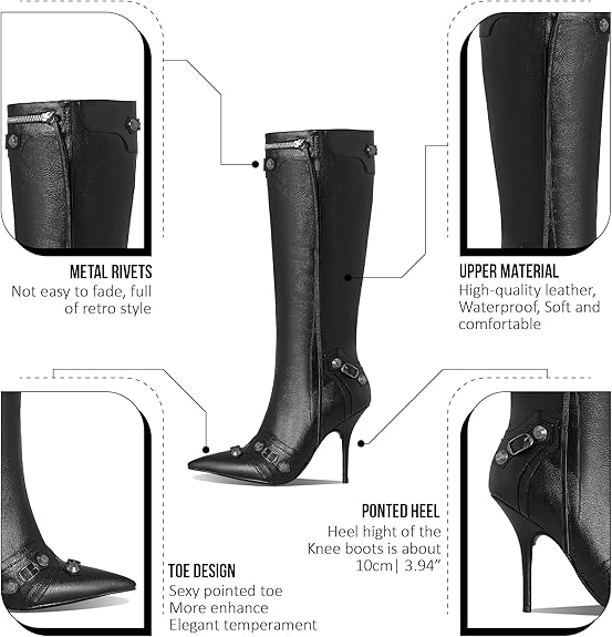 Đặc điểm của giày bốt cao gót nhọn: giày bốt cao gót nhọn dành cho nữ có gót cao chắc chắn và phần mũi nhọn thoải mái.