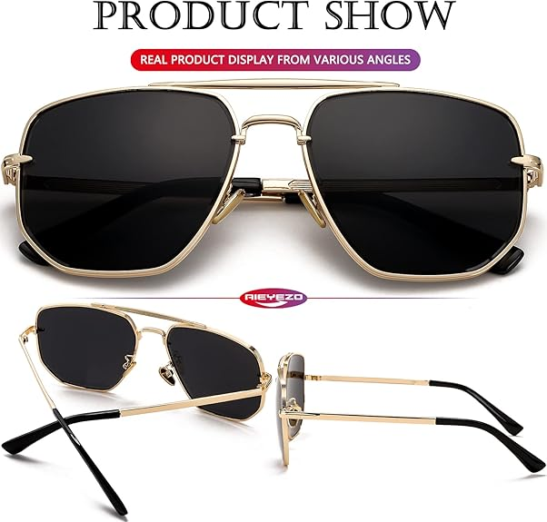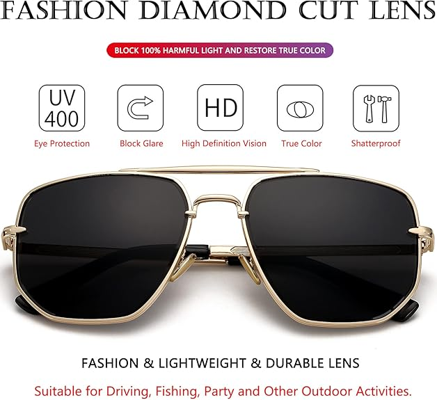 THIẾT KẾ TRÒNG KIM CƯƠNG CẮT Kính râm phi công vuông lớn với thiết kế cắt kim cương thời trang, mang đến cho chiếc kính râm này phong cách thời trang và cổ điển, bản lề kim loại gia cố, miếng đệm mũi bằng silicon có thể điều chỉnh và càng kính siêu thoải mái, giúp bạn thoải mái và bền hơn khi đeo.