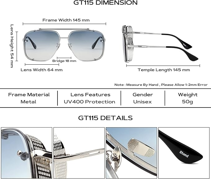 • KÍCH THƯỚC SẢN PHẨM - Chiều rộng tròng kính 64mm (2,52 inch) - Chiều cao tròng kính 54mm (2,13 inch) - Chiều rộng gọng kính 145mm (5,71 inch) - Chiều dài càng kính 145mm (5,71 inch) - Sống mũi 18mm (0,71 inch) - Trọng lượng nhẹ 50g. Lựa chọn kích thước: GT115-64mm phù hợp với nam giới có khuôn mặt to hoặc đầu to, nhưng có thể hơi quá khổ đối với phụ nữ. Nếu bạn muốn có kính râm quá khổ thì đây sẽ là một lựa chọn tuyệt vời.