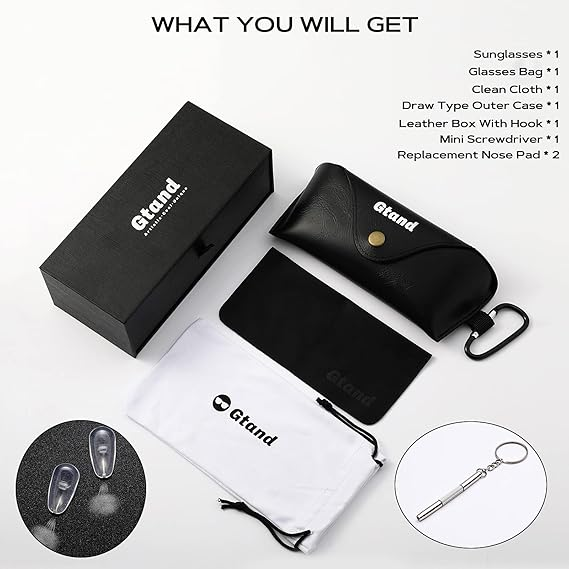 • BẠN SẼ NHẬN ĐƯỢC GÌ - 1. Kính râm * 1 - 2. Hộp đựng ngoài dạng ngăn kéo * 1 - 3. Hộp da có móc treo di động * 1 - 4. Vải sạch màu đen * 1 - 5. Túi đựng kính * 1 - 6. Tua vít nhỏ * 1 - 7. Miếng đệm mũi thay thế * 2. Gói ý tưởng quà tặng tinh tế này sẽ là món quà tuyệt vời cho gia đình và bạn bè của bạn!