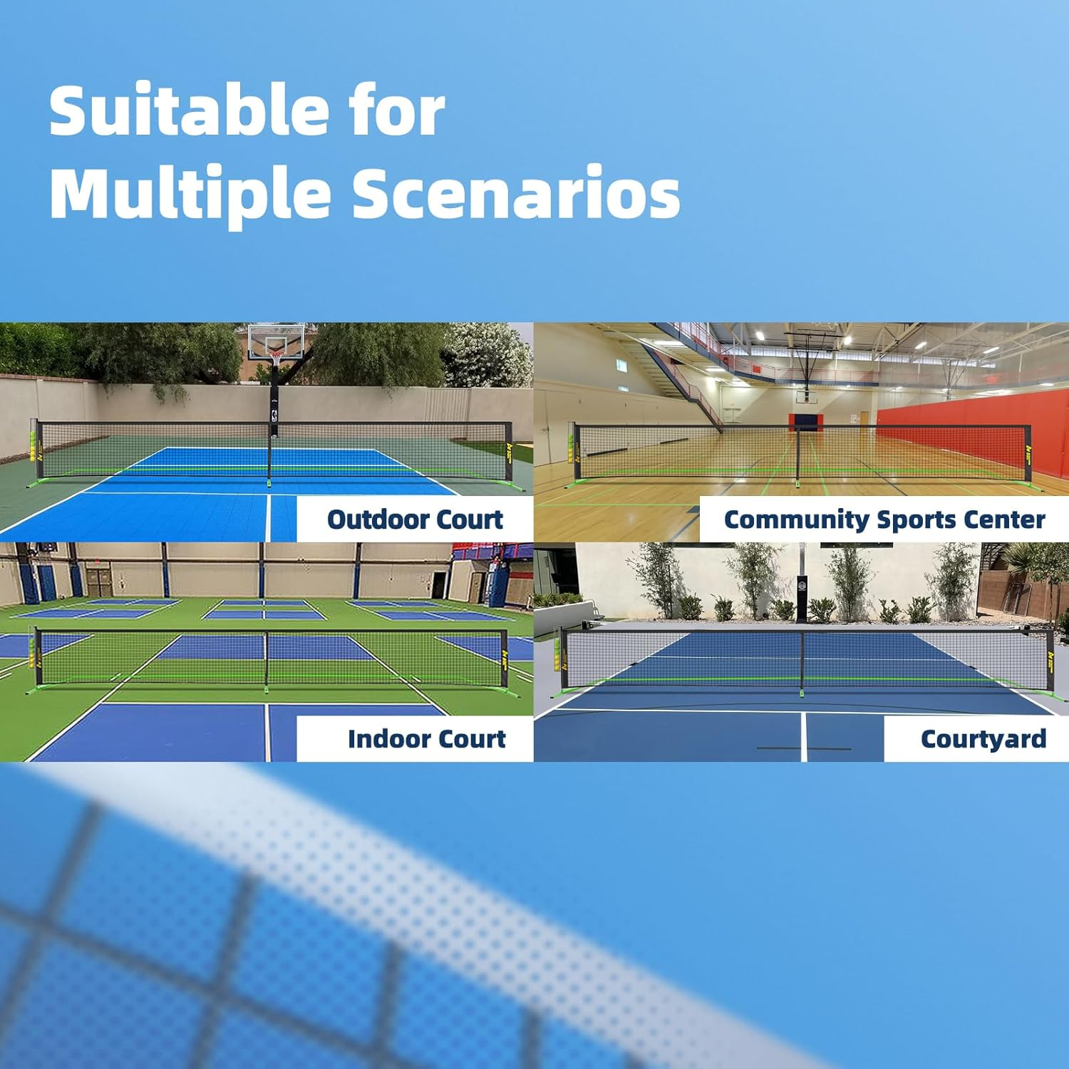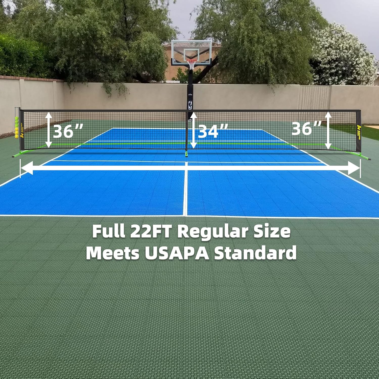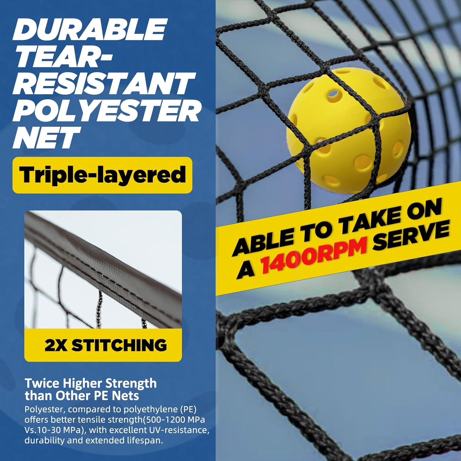 CẠNH ĐƯỢC KHÂU 2X + ĐỠ TRUNG TÂM + DÂY ĐEO CĂNG = HỆ THỐNG chống va đập】Được chế tạo bằng công nghệ bện nhiều lớp & khâu gia cố, lưới pickleball polyester của chúng tôi có trụ đỡ trung tâm & dây đai căng tích hợp cho phép bạn đặt lưới ở độ cao chính xác & giữ căng, tăng cường sức mạnh chống va đập lên gấp 5 lần so với các loại lưới pickleball khác. Mặt bạt PVC được khâu đôi, chống rách, chống tia UV & chống phai màu, chịu được các yếu tố ngoài trời khác nhau.