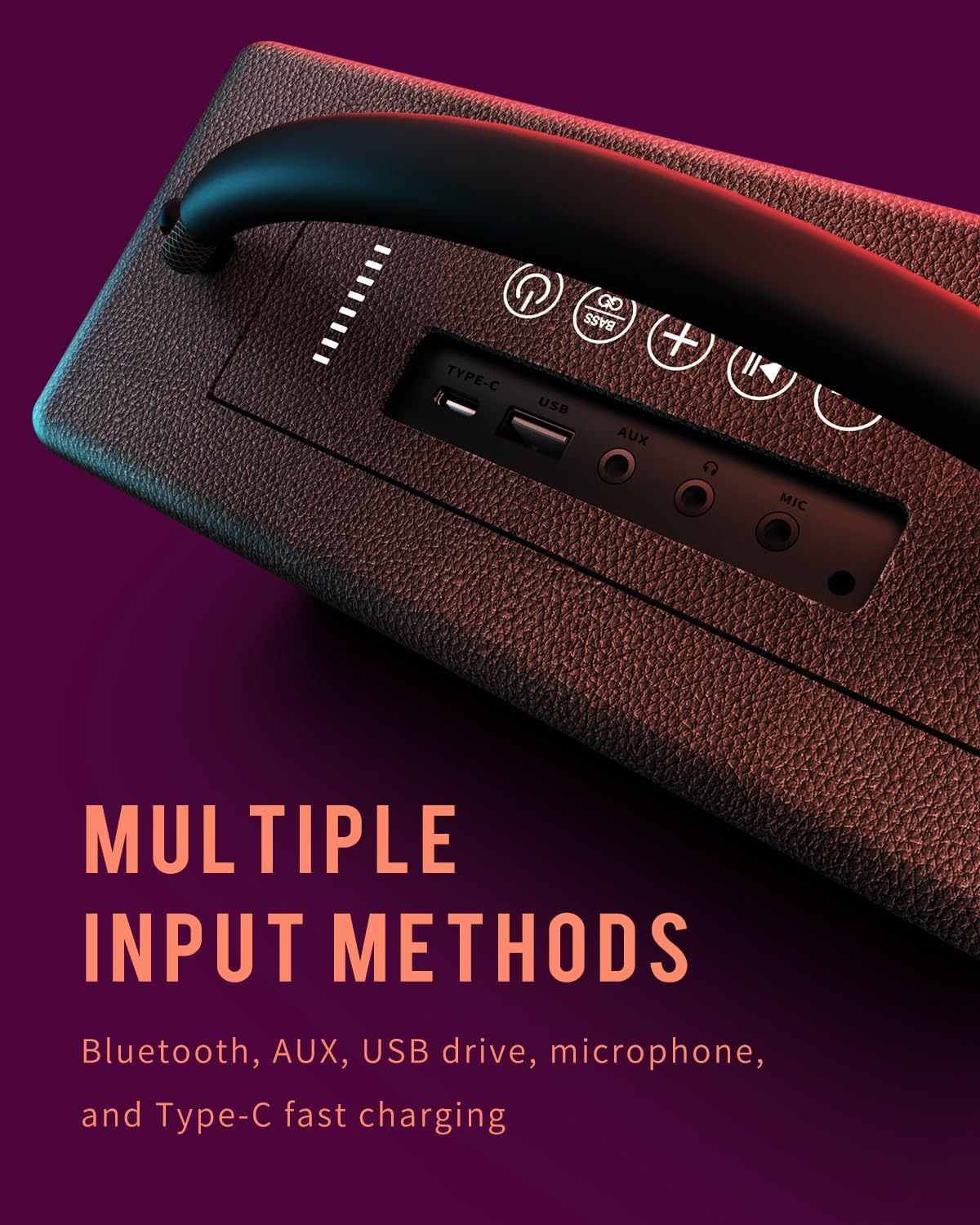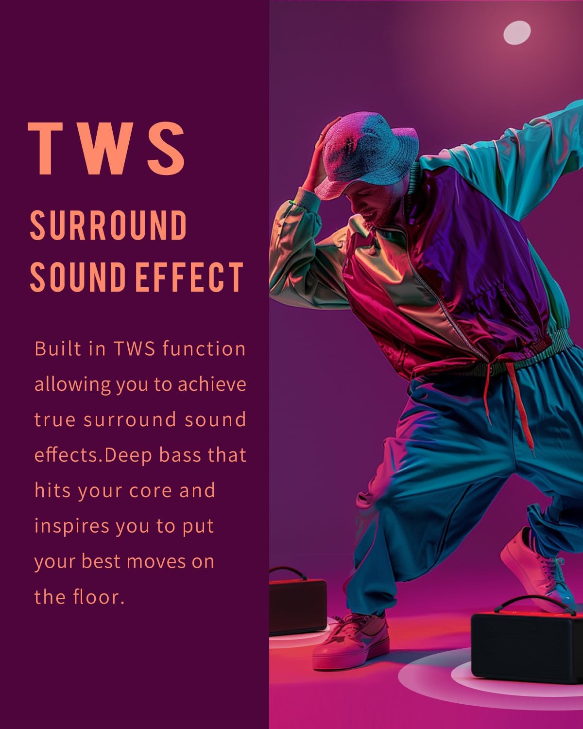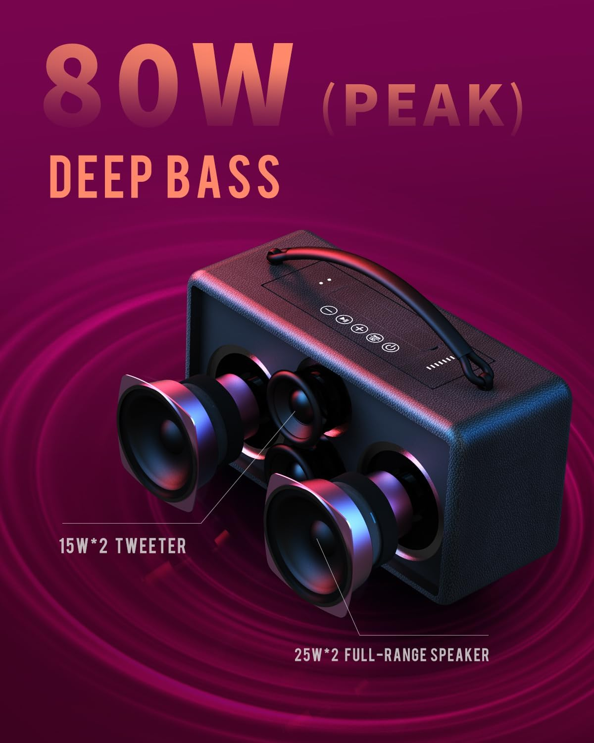 Loa Bluetooth di động DINDIN, Loa TWS không dây 80W (đỉnh) có âm trầm sâu, Thời gian phát 20 giờ, Âm thanh nổi vòm lớn, Đầu vào BT5.3/ AUX/USB/Mic cho Tiệc tùng/Ngoài trời/Trong nhà/Du lịch (Màu đen)