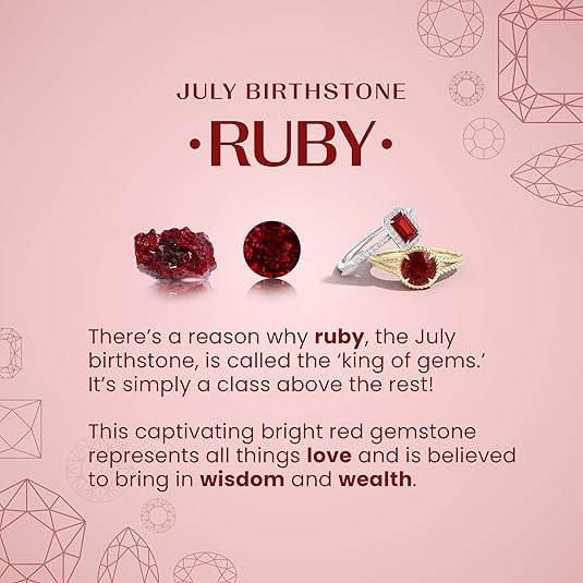 Sắc đỏ rực rỡ của Ruby khiến nó nổi bật mọi lúc. Đây là viên đá sinh nhật chính thức của tháng 7 và tượng trưng cho tình yêu, lòng dũng cảm, đam mê và sự cam kết. Hơn nữa, nó cũng là loại đá quý truyền thống cho lễ kỷ niệm 15 năm và 40 năm ngày cưới.