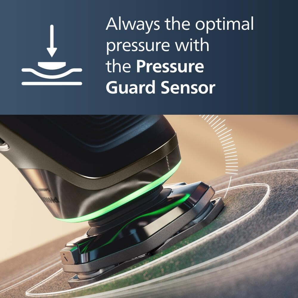 Luôn có áp suất tối ưu: Cảm biến bảo vệ áp suất thông minh bảo vệ làn da của bạn và đèn sẽ hướng dẫn bạn khi bạn ấn máy cạo râu quá mạnh hoặc quá nhẹ