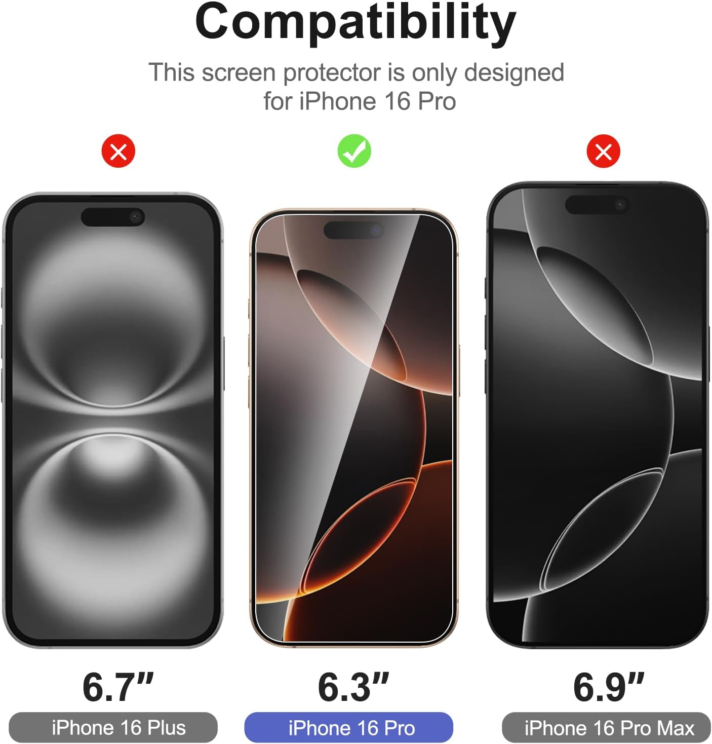 NEW'C [Gói 3 miếng dán màn hình được thiết kế cho iPhone 16 Pro (6,3 inch) Kính cường lực bảo vệ màn hình kèm theo công cụ lắp đặt dễ dàng, Thân thiện với ốp lưng, Siêu bền