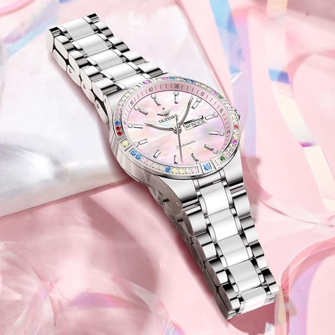 Womens Diamond Watches: Diamonds are set on the dial and bezel, perfectly matching the diamonds on the strap. The highly textured threaded crown shows off the stylish and luxury quality of the watch. With its double date display for day and date, it is a stylish and functional ladies' watch of the highest quality.