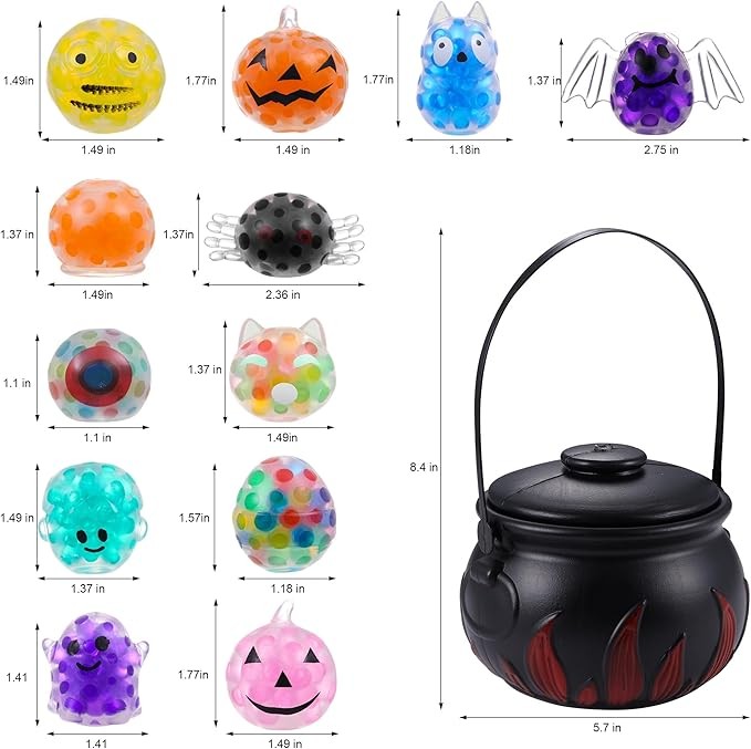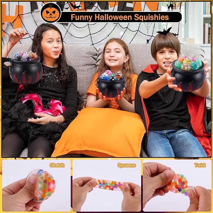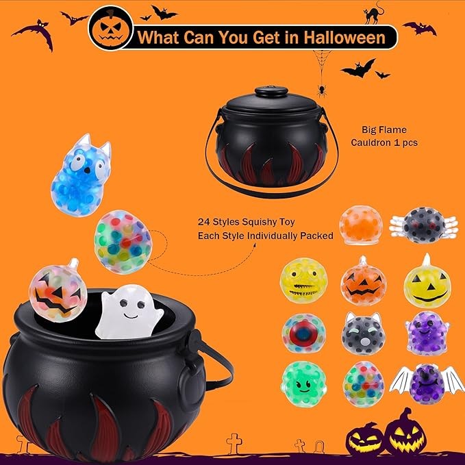 Novelty Halloween styles: our 24-piece squishy toy contains bat, ghost, cat, spider, blood hand and etc, Playful Halloween Cauldron large enough to fill with mochi toys or candies.