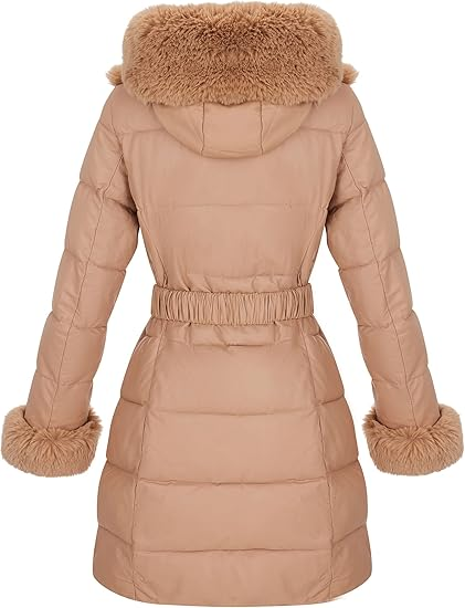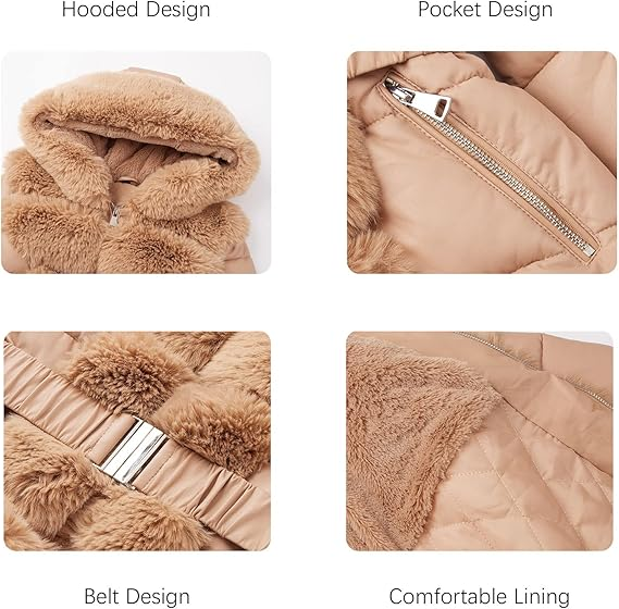 Feature: The puffer jacket women is designed with faux leather outer fabric, faux fur long collar extends to bottom, with fur hood, fur lined for upper half, fur cuffs, zip up closure, long sleeves, two pockets, removable belt. Cut with a loose fit, combined with fashion adjustable belt element, which touched snug and soft fuzzy coat for women. Well-made, unique design style can show your charm and vitality, add a sense of elegance and exquisite even in cold temperatures.