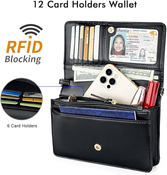 • [Thiết kế rộng rãi và an toàn]: Bên trong ví điện thoại đeo chéo có 1 ví chính, 1 ví đựng tiền xu có khóa kéo bên trong, 1 ngăn đựng tiền mặt, 12 khe cắm thẻ tín dụng (bao gồm 1 cửa sổ đựng ID). Một nắp có nút bấm để bảo mật hơn. 1 ví sau có thể vừa với ốp điện thoại có màn hình lớn 6,7 inch như: Apple iPhone 14 Pro Max, iPhone 11 Pro Max, Samsung Galaxy S23 Ultra, Samsung Z Flip/Fold 4, Moto C/E, Google Pixel 7.