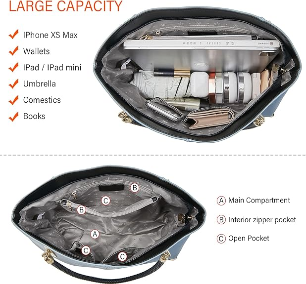 • THIẾT KẾ CẤU TRÚC - Túi tote da lớn của chúng tôi có 1 ngăn chính, 1 ngăn nhỏ có khóa kéo, 2 túi mở bên trong, 1 túi có khóa kéo bên trong và 1 túi có khóa kéo phía sau, vì vậy túi tote của chúng tôi có đủ chỗ cho những vật dụng thiết yếu hàng ngày của bạn. Nội thất rộng rãi có thể đựng iPad, điện thoại di động, tạp chí A4, ví, tài liệu quan trọng và nhiều thứ khác.