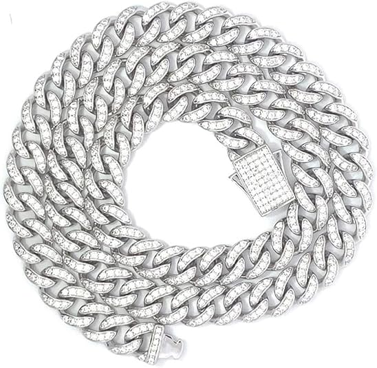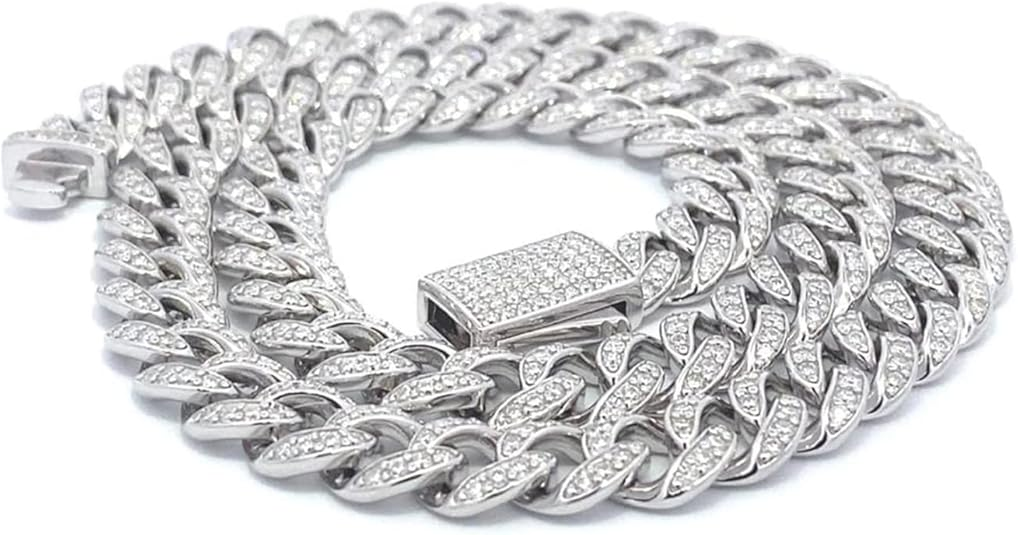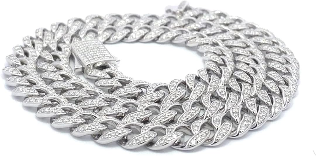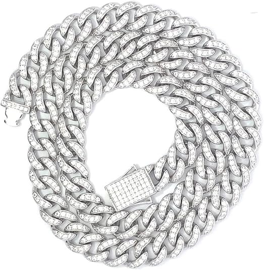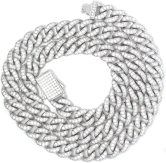 Đá quý: Moissanite nhân tạo cắt tròn 1,4MM và 1,2MM có độ tinh khiết VVS1, Kiểu đính: Kiểu đính lát, Tổng trọng lượng carat: 7,10 ct, Kiểu cắt rất tốt, Đóng dấu 925. Vòng cổ xích mắt xích Cuba này được cố định bằng hộp có lưỡi và móc cài an toàn.